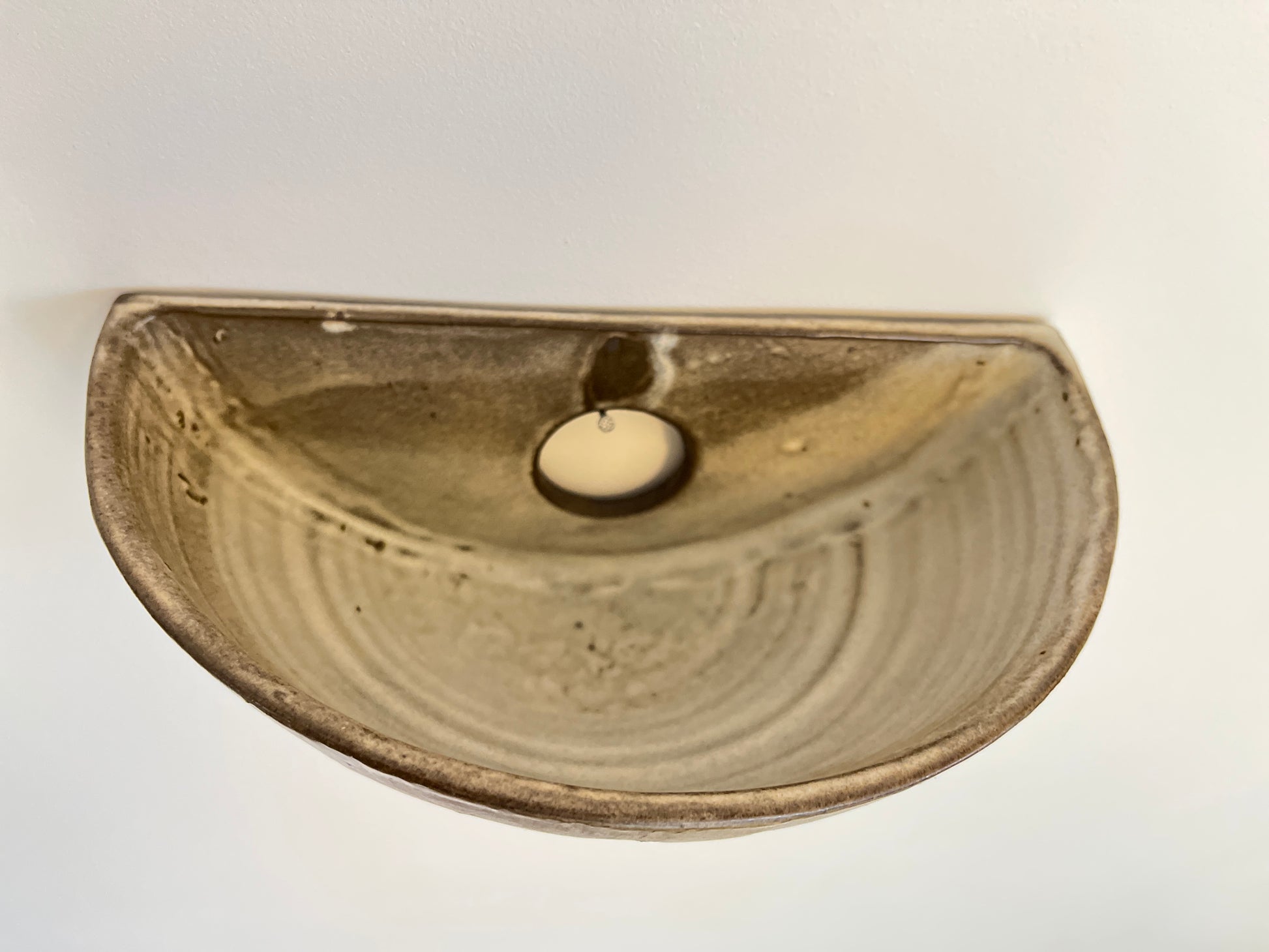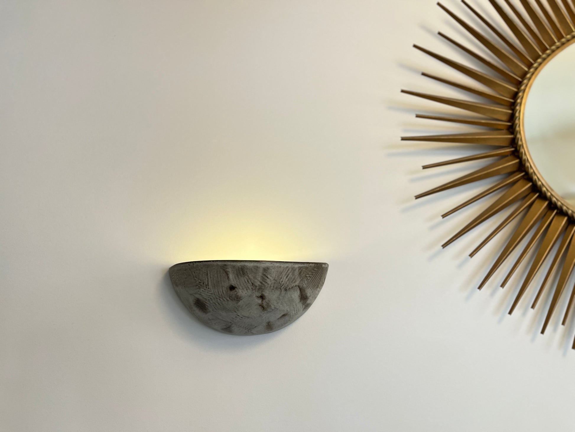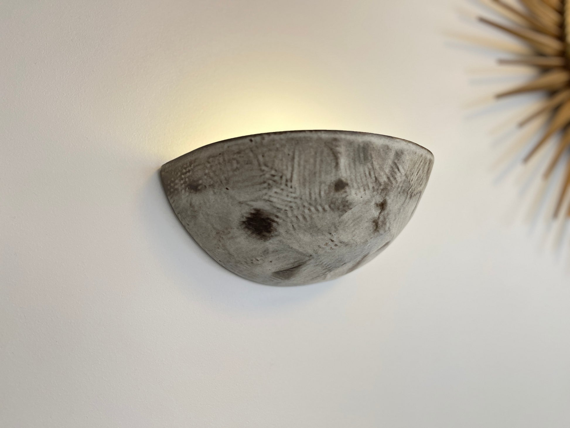 La pièce est en grè schamotté noir travaillé au tour pour la partie accueillant la lumière et assemblée avec une plaque pour l'accroche au mur.