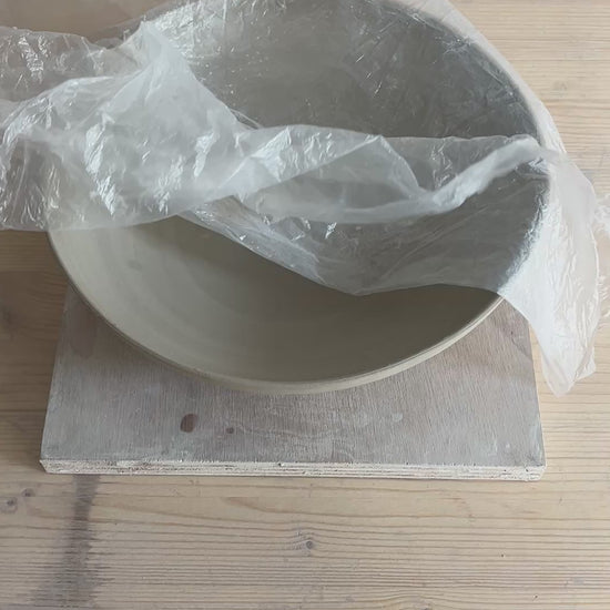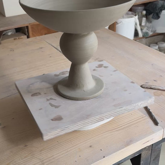 La pièce est en grès blanc lisse de Saint Amand (France) travaillé au tour. Afin de respecter le dessin initial de mon projet j'ai réalisé la pièce en deux parties. Une fois le pied et le bol de la coupe assemblés, la pièce a été cuite une première fois à 980° pendant 8 heures.