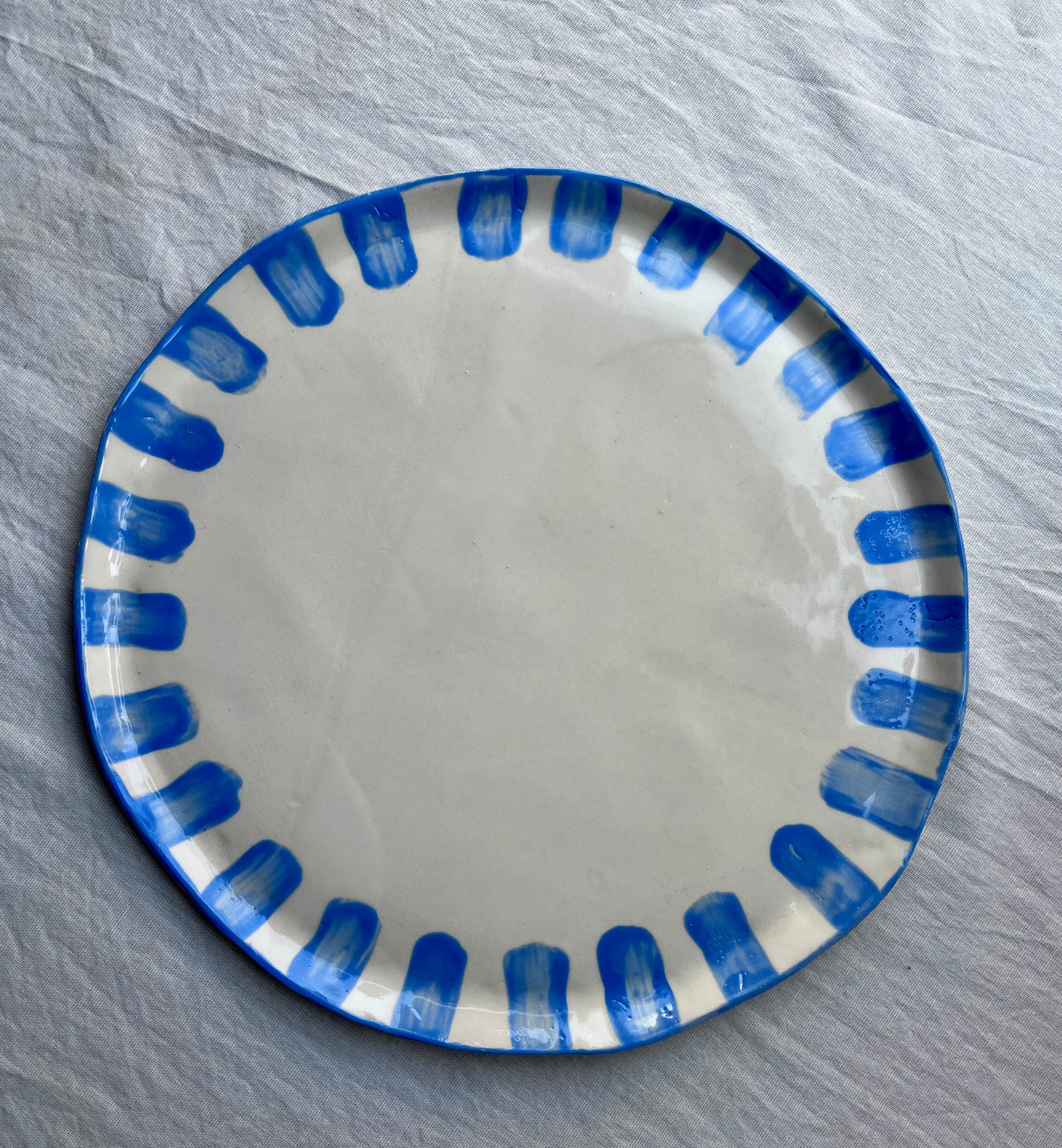 Le plat est réalisé à la plaque dans mon atelier à Paris, le dessin est réalisé à la main à l'engobe puis la pièce est cuite une première fois à 980° pendant 8 heures.